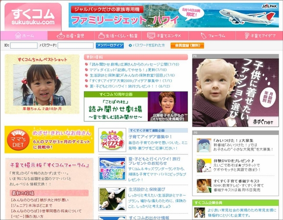 「すくすく.COM」は子育て中の家族を支援すること、そして社会や地域が育児に深い理解をもち、ともに子育てを支援してゆく環境を実現することを目的に1999年にスタートした育児支援サイトです。ユーザーは無料会員登録をすることで、同じ感動や悩みを抱える、全国の会員同士のコミュニケーションを促進する「フォーラム」や、ダイエット記録ツールをはじめさまざまな機能を備えた「マイページ」を利用することができます。