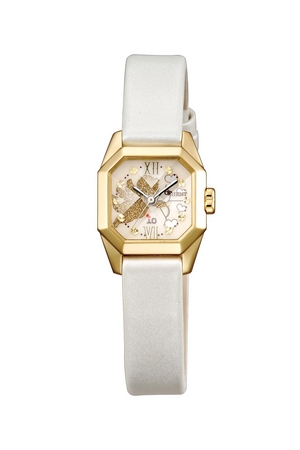 ダイヤルには、輝きを放つキラキララメのデコ天使が施されています。カットインデックスやカットクリスタルガラスが輝きを際立たせた、ハッピー感いっぱいのデザインです。サテン調バンドやダイヤル全体には、ホワイトを基調としたカラーリングを採用しています。