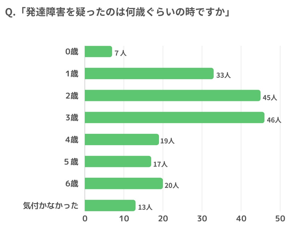 発達障がいを疑った時期についてのアンケート調査した結果、一番多かったのが、2歳~3歳でした。