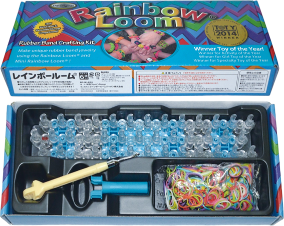 「レインボールーム」(Rainbow Loom®)は、アメリカで2011年より販売を開始し、2013年の年間販売数が300万セットを超え、大ヒットとなったブレスレット制作キットです。“Loom”(ルーム)の意味は、「織機」、「編機」、「道具」です。レインボールーム(プラスチック製の輪ゴム編みキット)にさまざまな色の輪ゴムをはめ込み、専用のフックを使用して輪ゴムを編み込んでいくことによって、自由な発想でブレスレットを制作することができます。アメリカでは女の子はもちろん、男の子の間でも人気で、品薄の状態が続いています。
