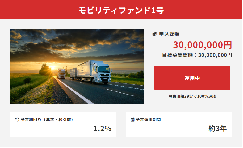 株式会社クラウドファンディングは、一般投資家からクラウドファンディングで資金を募り、運送事業者を金融面で支援するファンド「モビリティファンド🄬」の第1号案件となる「モビリティファンド1号」の募集を2022年11月に行い、開始から29分で完売することができました。運送事業者の経営改善を目的としたクラウドファンディングは本ファンドが日本初* となりますが、弊社では既に第2弾として1.4億円規模の「モビリティファンド2号」の準備も進めており、12月中にも募集を開始する予定です。弊社では「所有から利用する時代へ」のトレンドに合わせて今後もモビリティファンドを組成し、広く運送事業者の経営環境の改善、ドライバーの待遇改善などのSDGsへの取り組みを加速させてまいります。