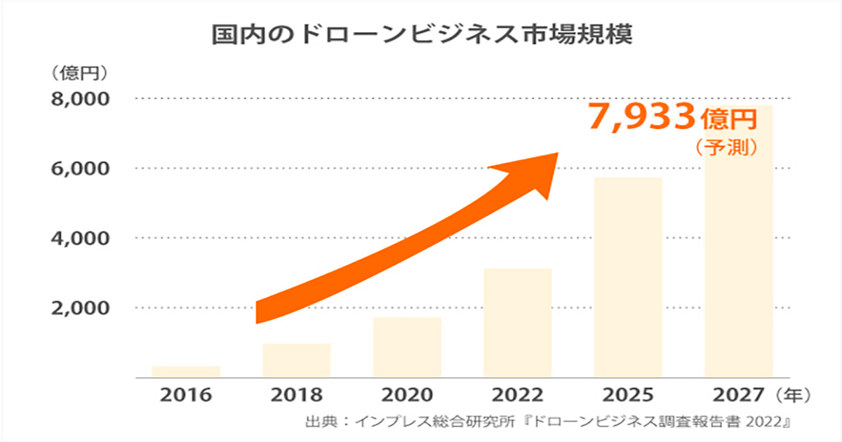 2021年度の日本国内のドローンビジネス市場規模は208億円と推測され、2027年度には7933億円に達すると見込まれています。特にインフラや土木・建築分野におけるドローンの利用が拡大しており、ドローン操縦士の需要は年々高まっています。
