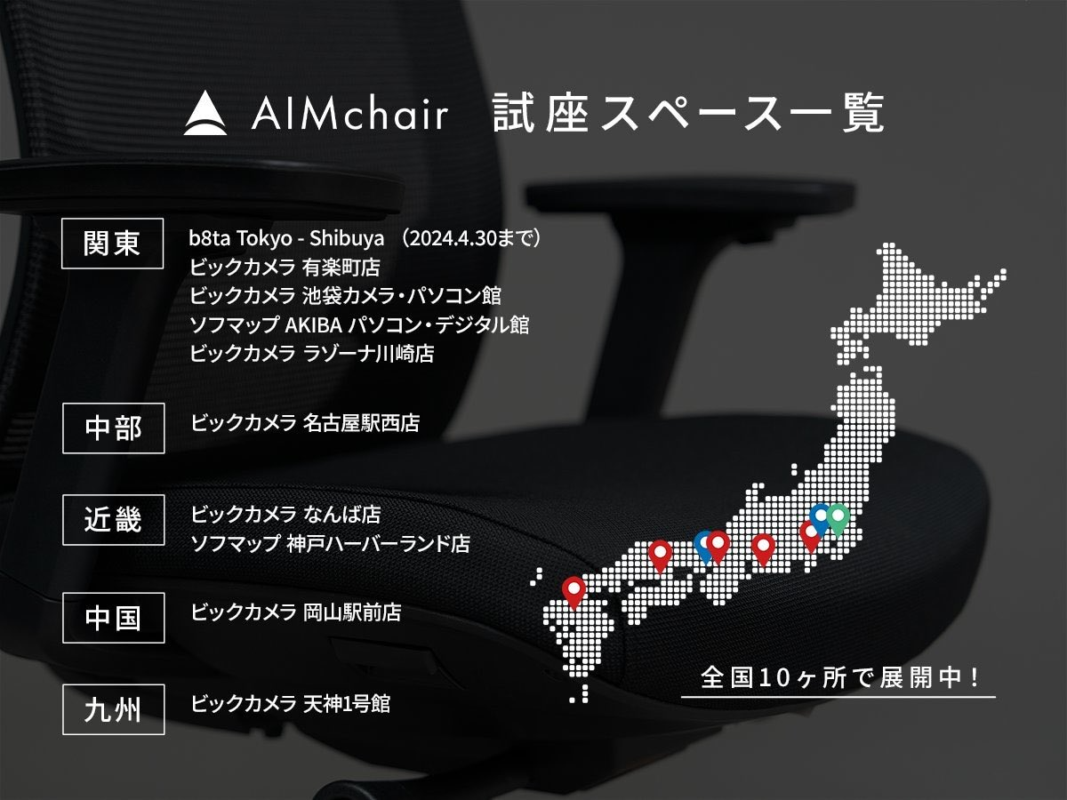 「AIMchair」は公式オンラインストア限定販売となっていますが、実際に座ってみたいというユーザーの要望に応え、現在東京を中心とした日本各地で試座できる場所を設けています。