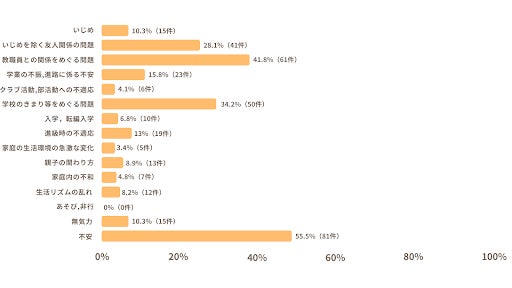 解答の中では「不安」が最も多く55.5%、「教職員との関係をめぐる問題が41/8%」、「学校の決まり等をめぐる問題」が28.1%と続きました。