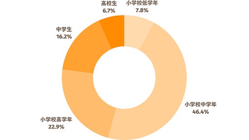 小学校低学年が7.8%(14件)、小学校中学年が46.4%(83件)、小学校高学年が22.9%(61件)、中学生が16.2%(29件)、高校生が6.7%となりました。1〜5歳までの未就学児のお子さんを持つ保護者の方からの回答はありませんでした。