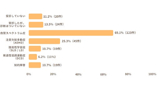 自閉スペクトラム症が69.1%と最も多く、次に注意欠如多動症(ADHD)が続きました。