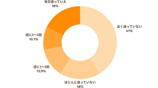「全く通っていない」と答えた方が41%、「ほとんど通っていない」と答えた方が18%「、週に1〜2回」と答えた方が12.9%、「週に3〜4回」と答え方は10.1%、「毎日通っている」と答えた方は18%となりました。