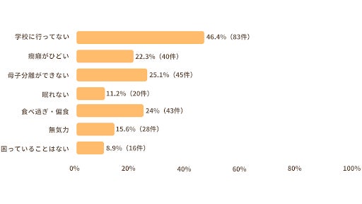 「学校へ行ってない」が46.4%、「母子分離ができない」が25.1%、「食べ過ぎ・偏食」が24%と続きました。