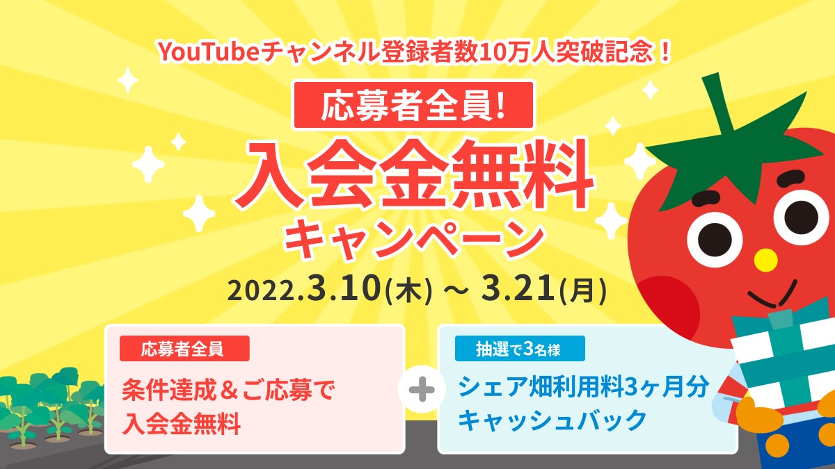 農業ビジネスを展開するアグリメディア(目黒区、代表取締役:諸藤貴志)は、公式YouTubeチャンネル『シェア畑-農園らいふ-』のチャンネル登録者数が10万人を突破したことを記念し、2022年3月10日(木)から「応募者全員!入会金無料キャンペーン」を開催致します。