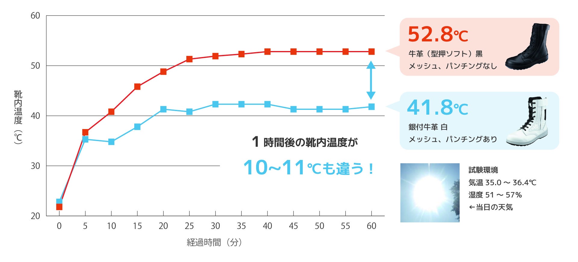 ※自社製品比・自社調べ(気温35.0~36.4℃、湿度51~57%、日光が当たる環境において5分おきに60分間、靴内の温度を測定)