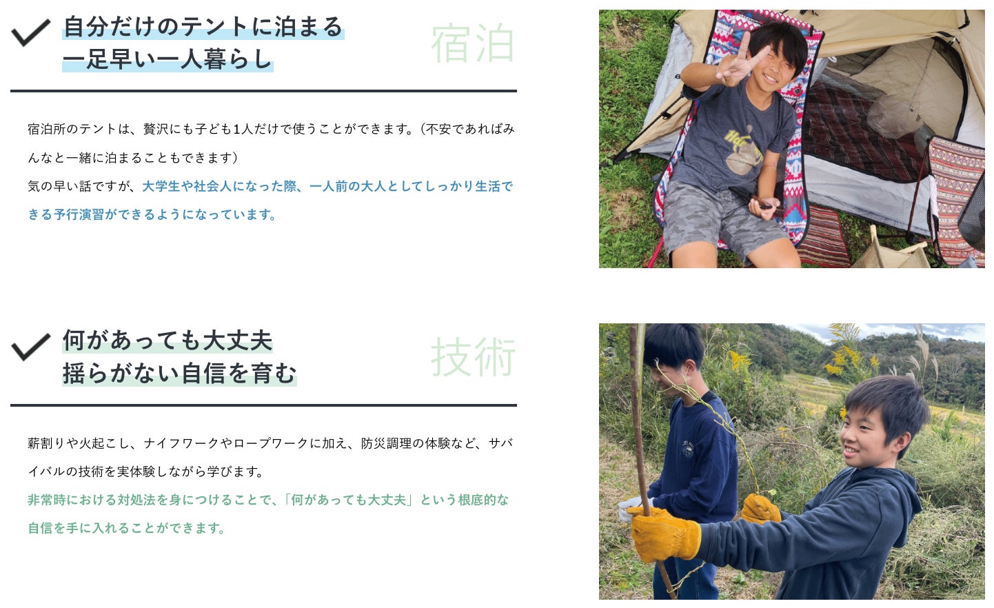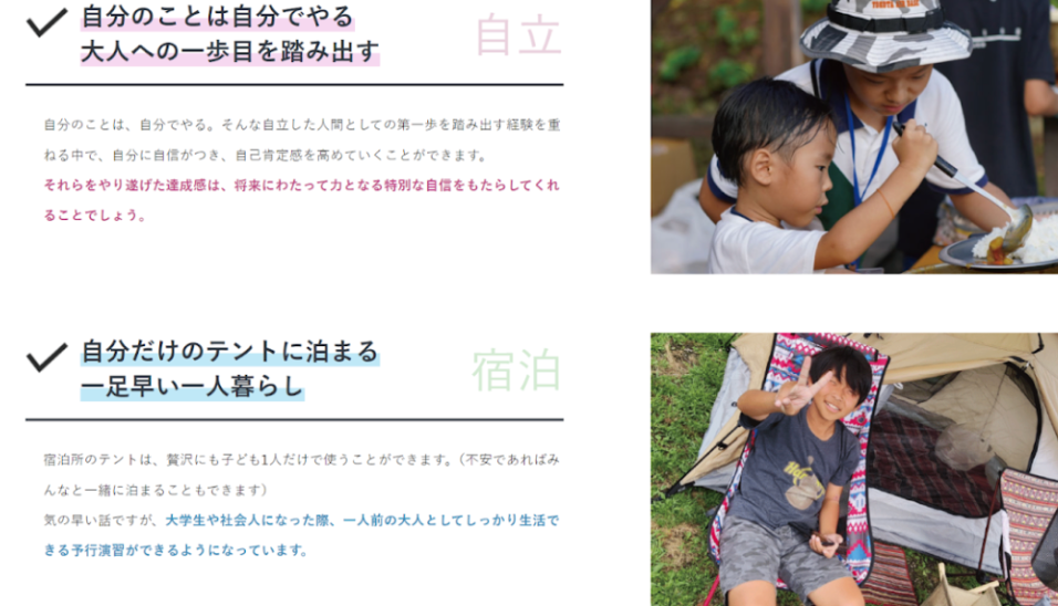キャンプやアウトドアの楽しさを通じて、防災、環境、食育についても学べる、実践的なアウトドアプログラムを提供します。自立力を育み、自己肯定感を高めることで、主体的に考え、行動できる子どもたちを育てていきます。