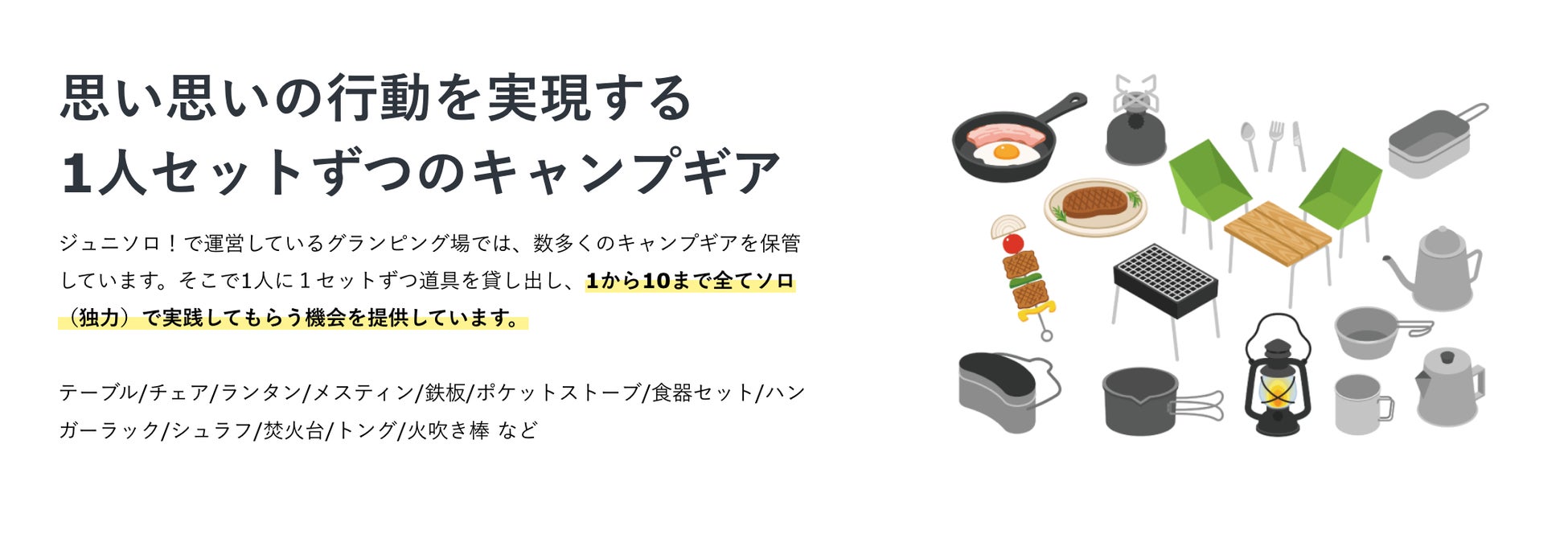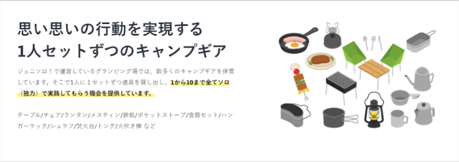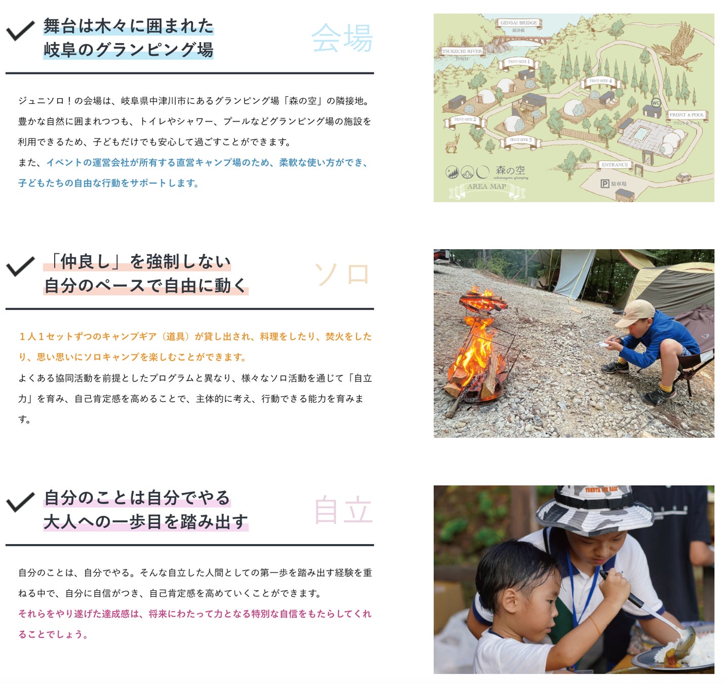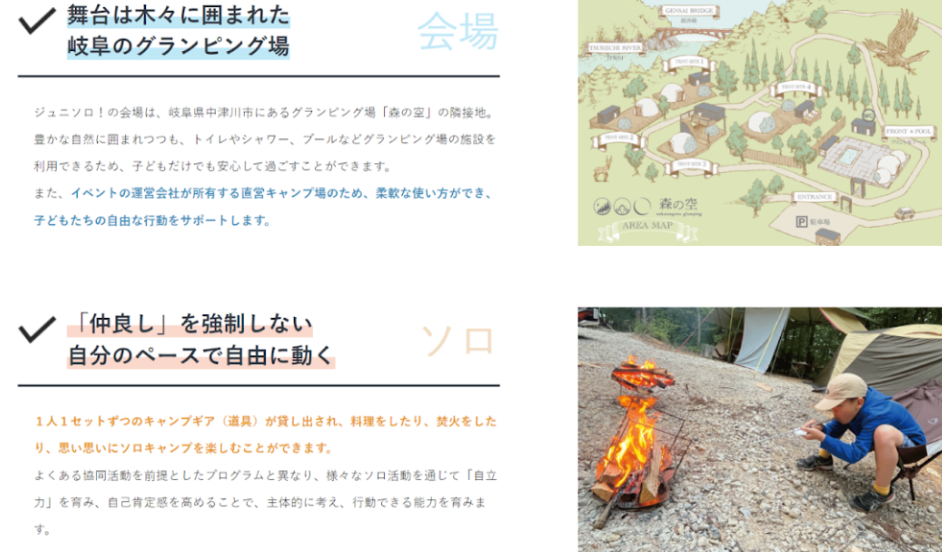 興味はあるけど、子どもがソロキャンプするのは心配…という方にオススメなのが「ジュニソロ!」です。