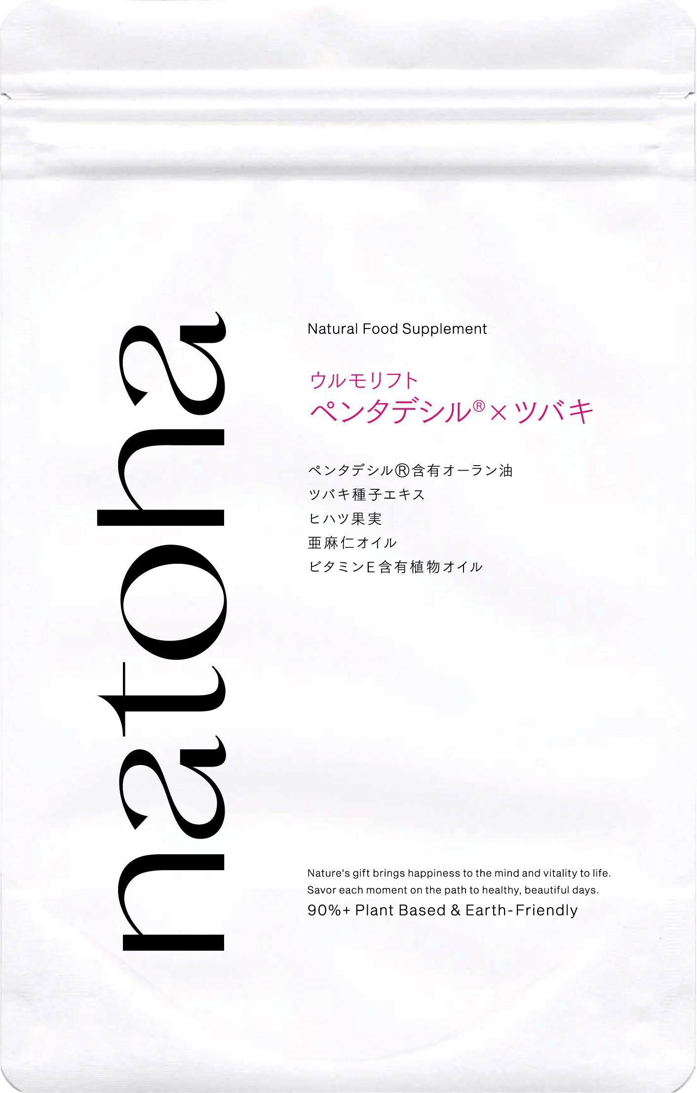 「健やかから美しく」をコンセプトに、食を通じて毎日のスキンケアを一段上げ、ハリのあるしなやかな毎日を目指す、注目の天然由来×特許成分をW(ダブル)配合したフードサプリメント。主原料である藻から生まれたペンタデシル®含有オーラン油、ツバキ種子エキスだけでなく、亜麻仁オイルや無農薬ヒハツ、ビタミンE含有植物オイル(d-α-トコフェロール)など副原料にもこだわり抜き、普段の食生活では不足しがちな栄養素を1粒に詰め込んだ植物性成分90%超*の贅沢処方です。