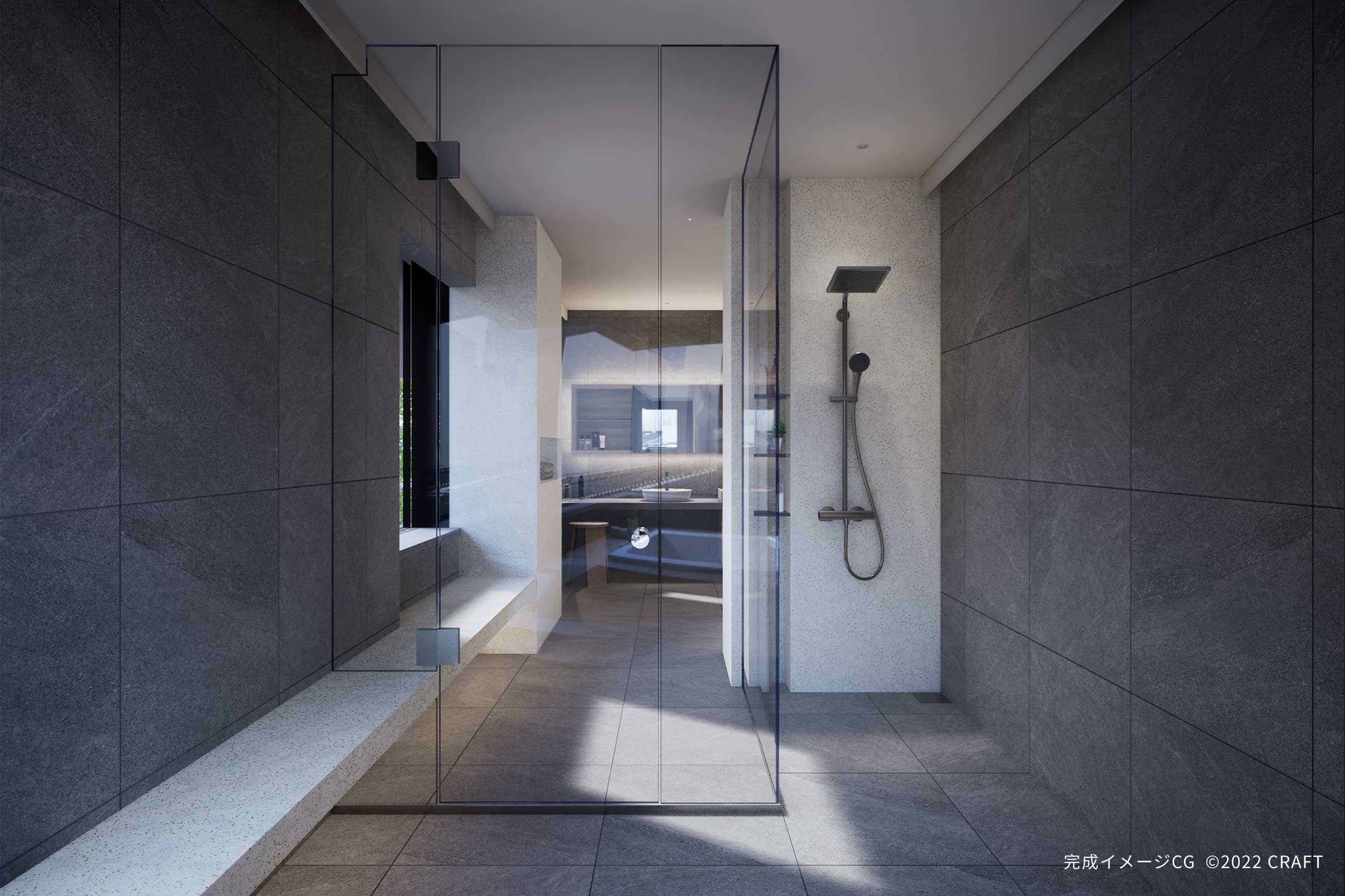 バスルームは寝室サイドに配置しました。床と壁はパウダールームと同⼀タイルで統⼀し、ガラスの間仕切りで奥まで⾒せることで、実⾯積以上の広がりを感じさせています。壁際のベンチはドアの向こうまで連続させ、伸びやかなイメージを与えました。ラグジュアリーなレジデンスにふさわしい、ホテルライクなバスルームです。