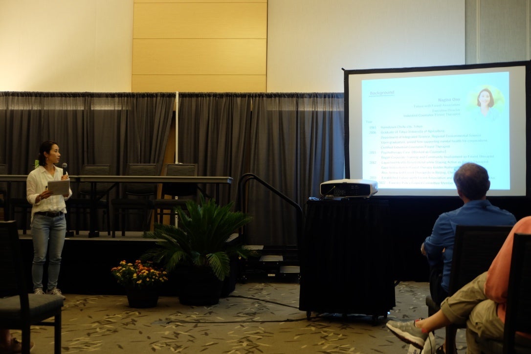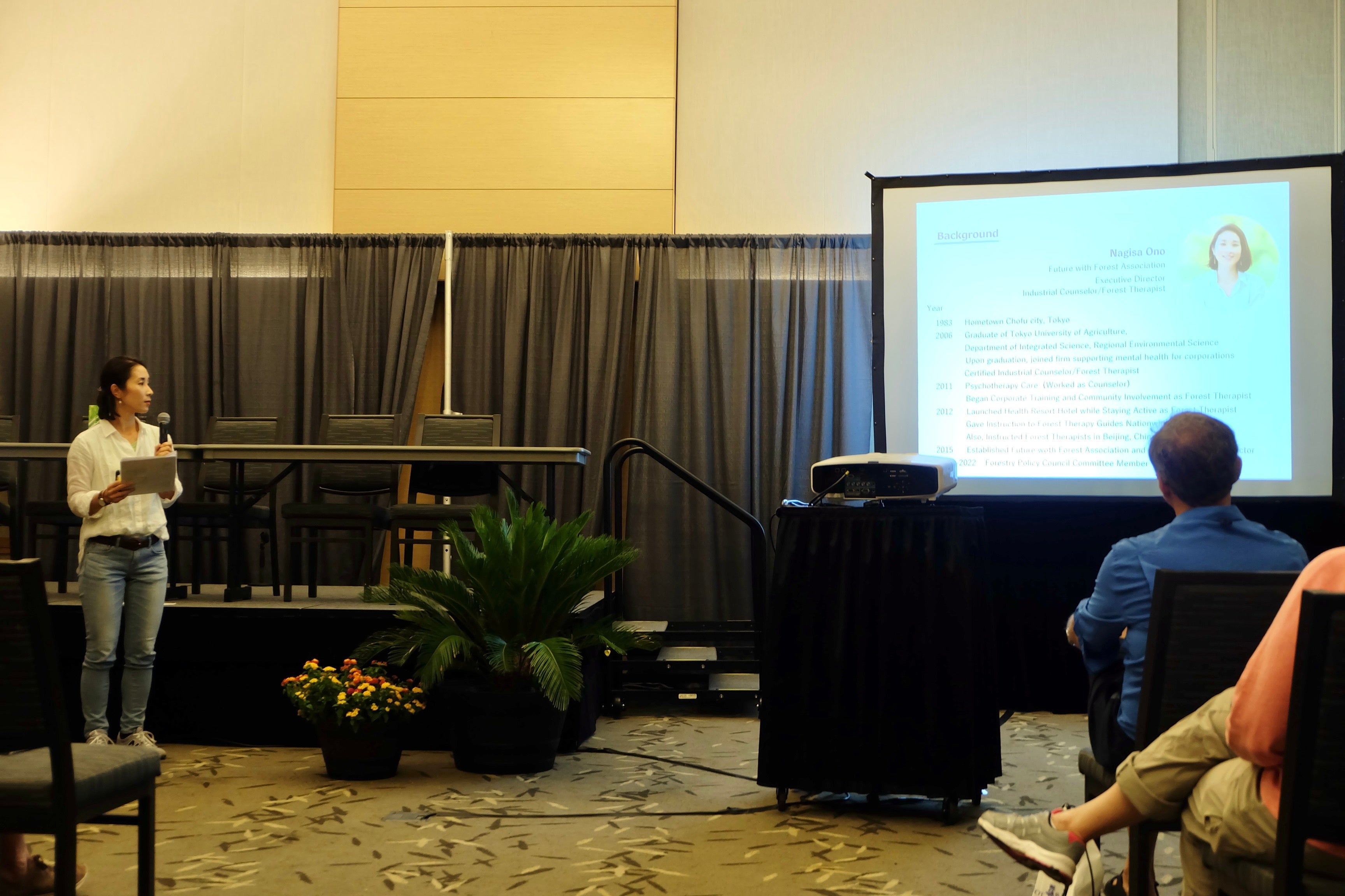 日本から森林浴の効果が医学論文に掲載され、外国語で書籍なども世界中に発売されると、森林浴は日本から生まれた "Shinrin-yoku"(シンリンヨク) として世界中に広まり、森林で行う健康法としてその魅力が伝わっています。また、海外では森林浴のプログラムを提供するガイド育成を行う団体も誕生しています。森と未来は2019年 にアメリカソノマ州立大学で開催された森林浴の国際カンファレンスに呼ばれ日本の森林浴について講演をしました。