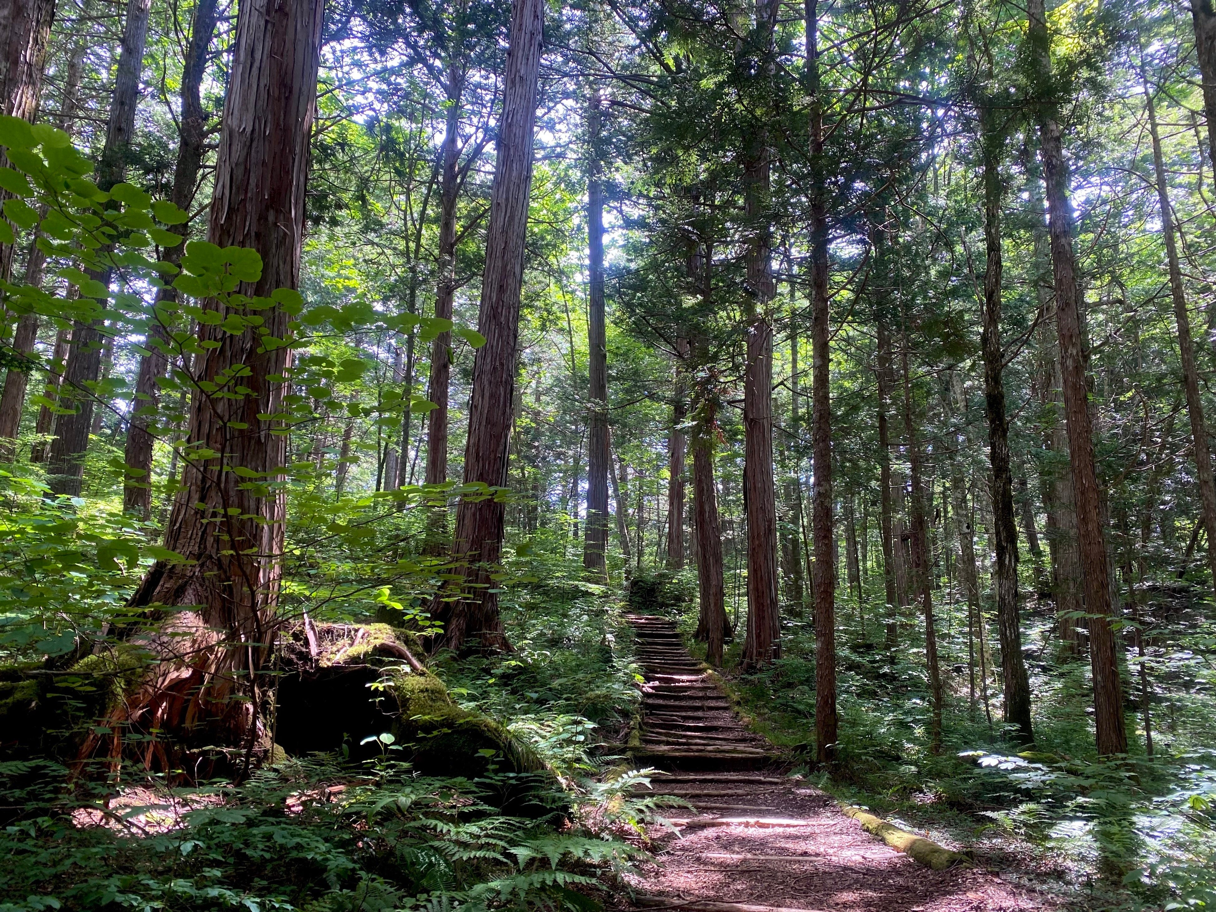 森林浴発祥の地で森林浴体験。樹齢300年を超える木曽ヒノキの天然林がある国有林。