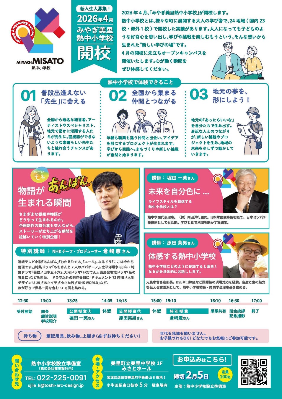 本イベントは、2026年4月開校予定の「みやぎ美里熱中小学校(第1期)」の内容紹介も兼ねて実施。4/4~9/5の毎月第1土曜 13:00~16:00/1日2コマ制、全国の著名講師+地元の優秀な講師陣による授業、オンライン配信とアーカイブ視聴あり、学びのテーマは食・音楽・地域ビジネスを中心に展開します。