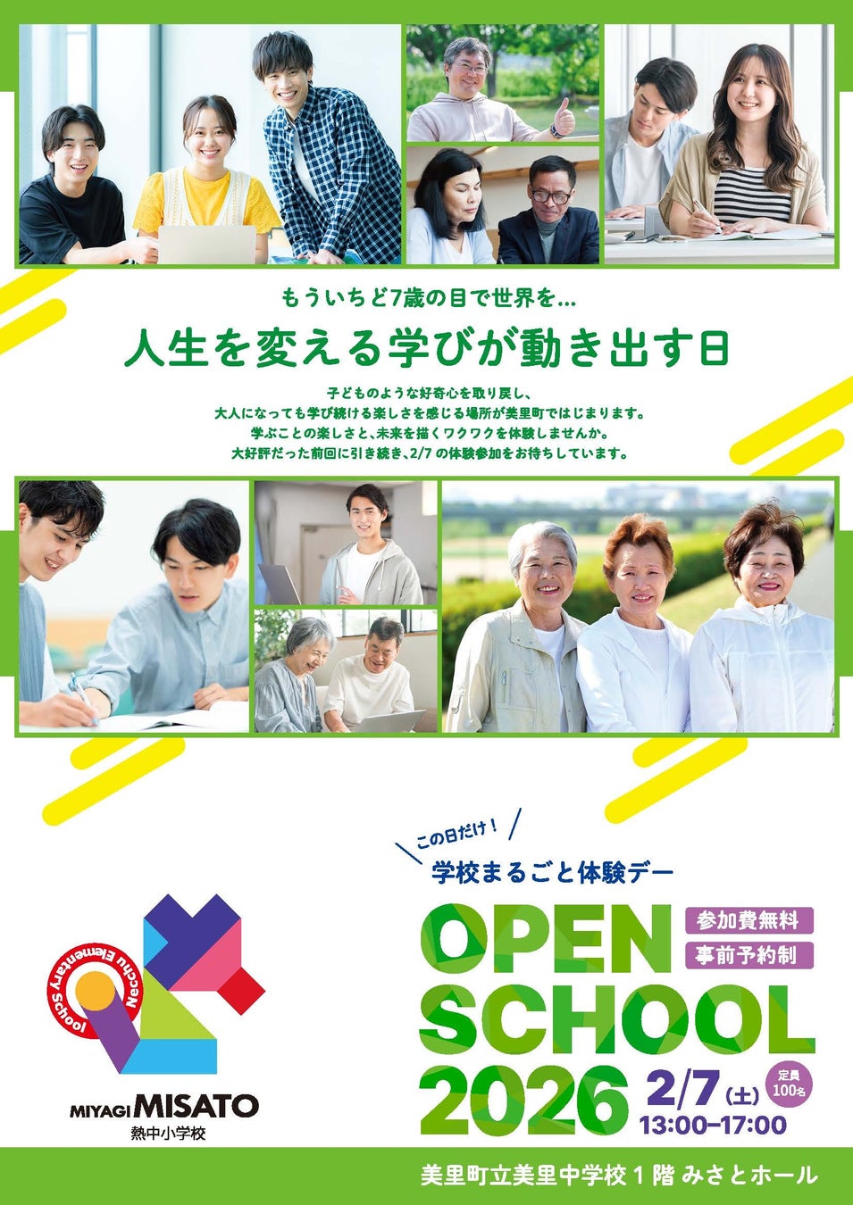 みやぎ美里熱中小学校(宮城県美里町)は、2026年2月7日(土)13:00~16:00、第二回オープンスクール(OPEN SCHOOL)を開催します。