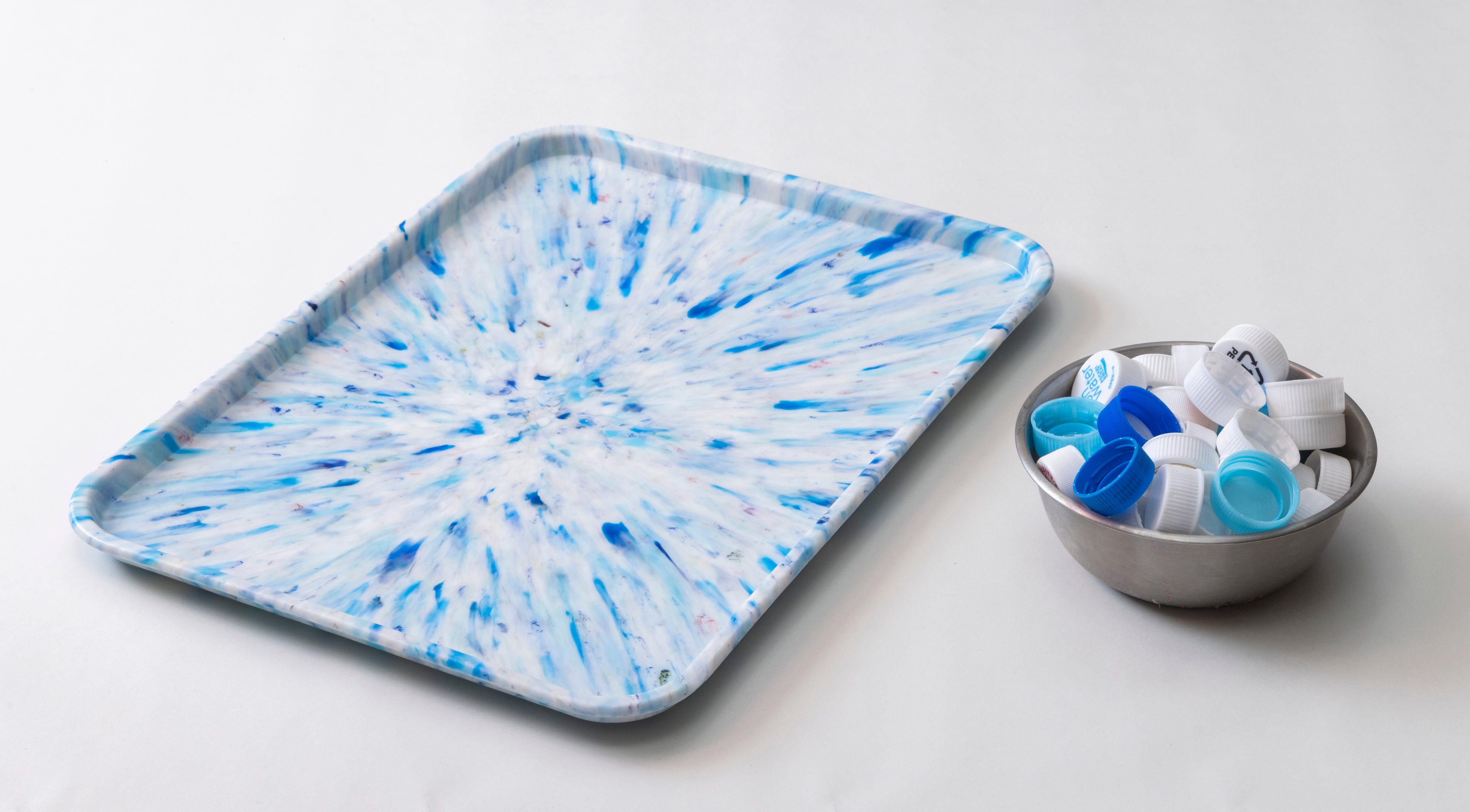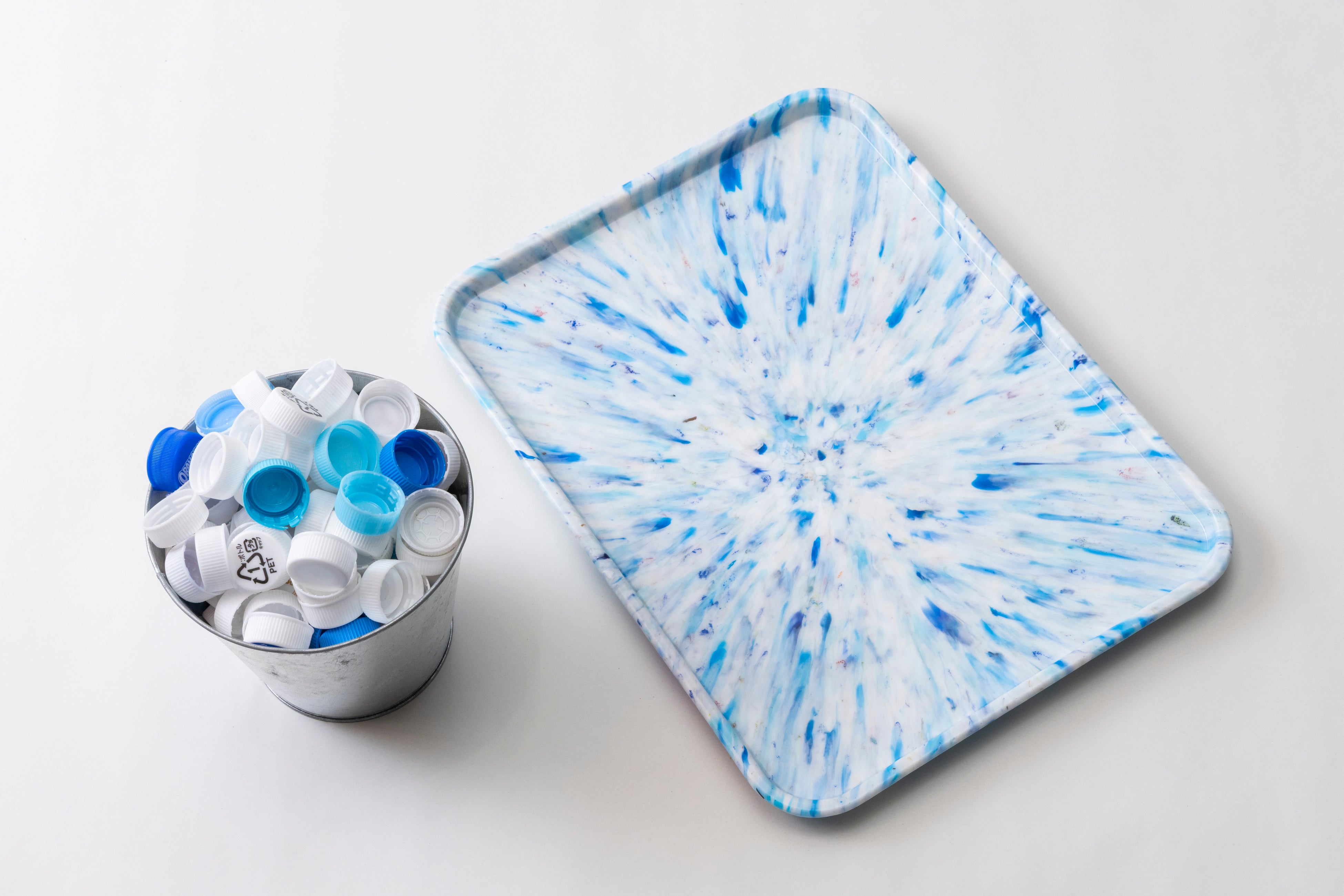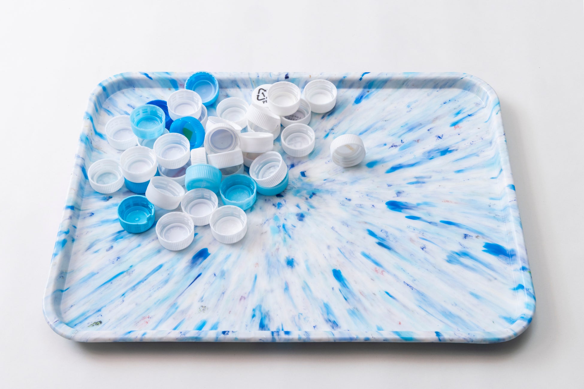 一点ずつ異なるマーブル模様は、包まれたキャップや海洋プラスチックなどの素材の色や形をそのまま活かしており、リサイクル素材ならではの個性を表現しています。