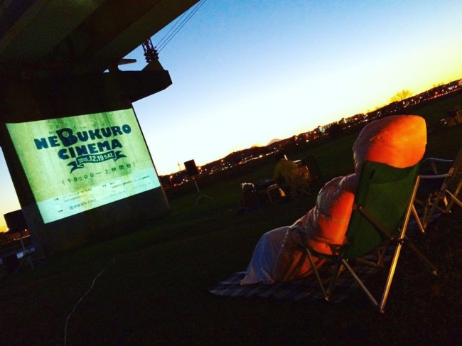 「ねぶくろシネマ」とは、 2015年12月に調布に住む父親たちが、小さなこどもと一緒に気楽に映画が観られるようにと、多摩川河川敷に一夜限りで作った映画館。映画のタイトルは、父親たちが昔観て影響を受けた映画であることと、満月の夜に「E.T.」。海辺の公園で「グーニーズ」など、場所に合うということを重視。