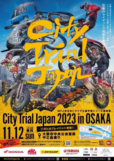 ヨーロッパで人気の高いトライアル。しかし、日本では世界に通用するライダーが大勢いるにもかかわらず、まだまだマイナースポーツの域を出ることができずにいます。その大きな要因の一つが、やはり「目に触れる機会が少ない」ということ。そこで当実行委員会では、2018年4月21日に第1回目となる「City Trial Japan 2018 in Osaka」を初開催。2019年~2022年の開催を経て、今回は全日本選手権最終戦(日本一決定戦)の位置づけで開催。