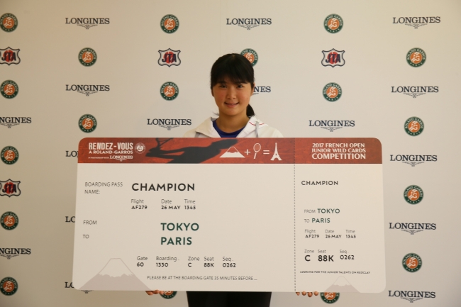 日本予選を優勝した白石選手と永田選手は、同じく世界6か国の予選を勝ち抜いてきたプレーヤー達を相手に、ローラン・ギャロスで開催される「全仏オープン・ジュニア2017」への出場権を懸け、「全仏オープン・ジュニア2017 ワイルドカード選手権大会 in partnership with LONGINESワイルドカード選手権」(2017年5月26~27日/フランス・パリ)を戦います。世界最高峰のレッドクレーコートを舞台に、世界の同世代のエリートプレイヤーたちと対戦することで、今後の日本テニス界を牽引していくプレーヤーに成長することを期待しています。