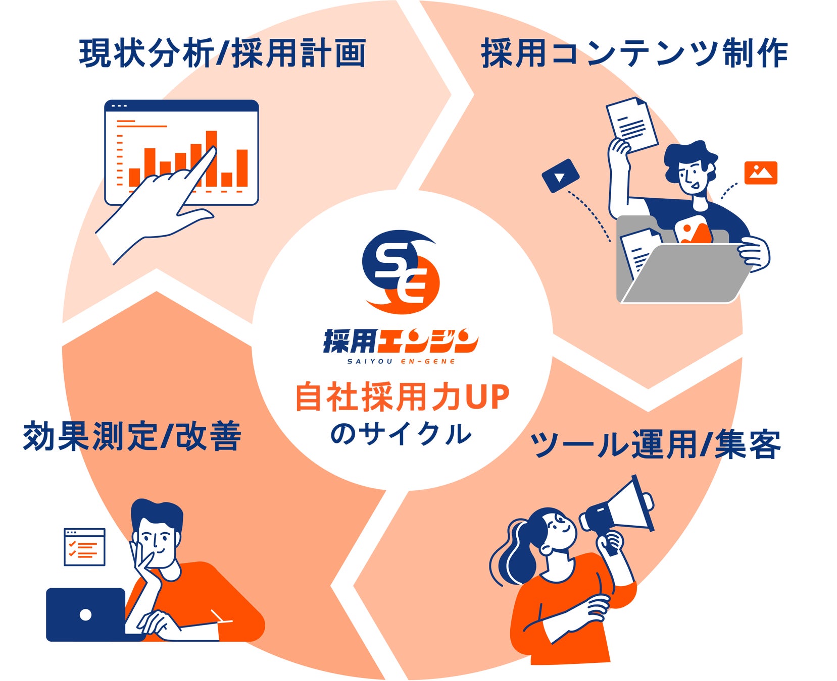 「採用エンジン」は、従来の求人広告運用の代行業務にとどまらず、自社採用力を上げるサイクルを伴走型で提供します。