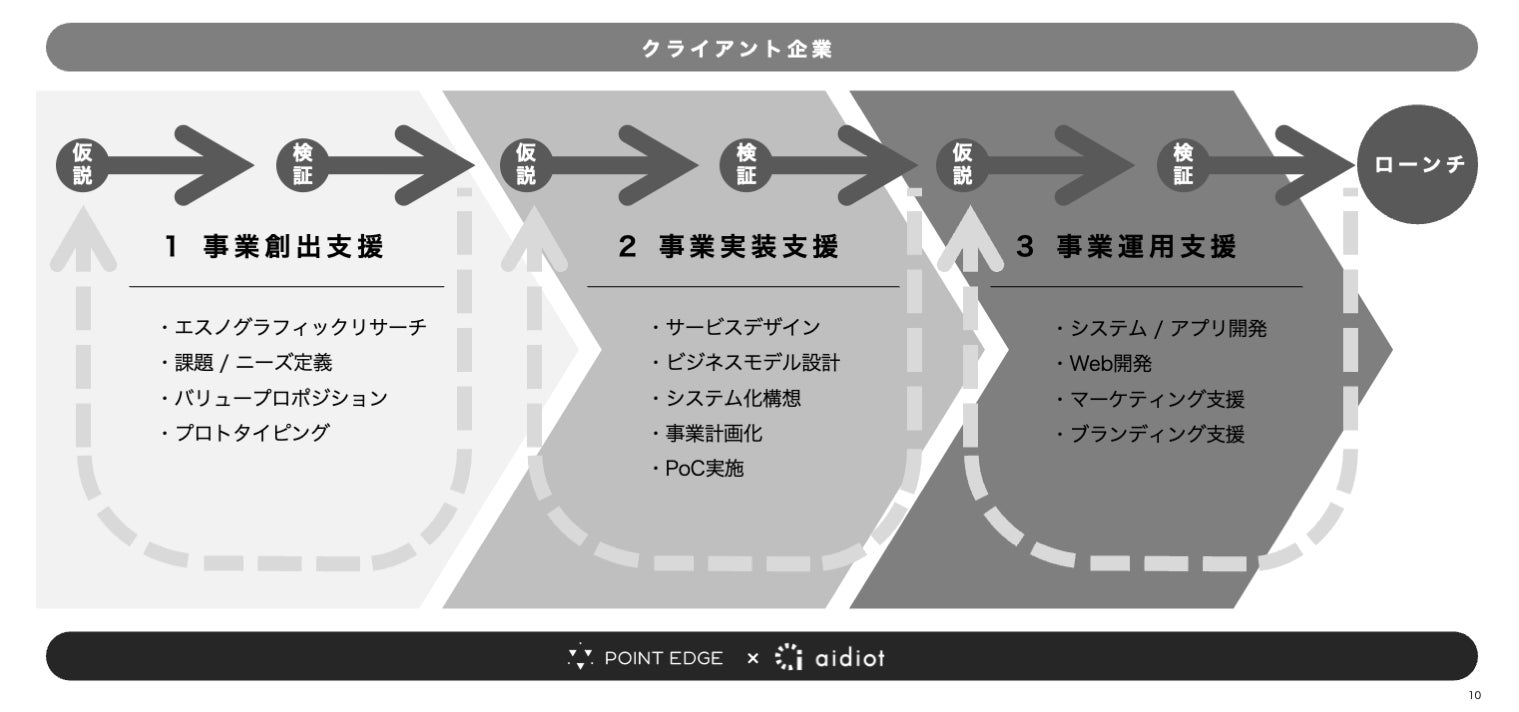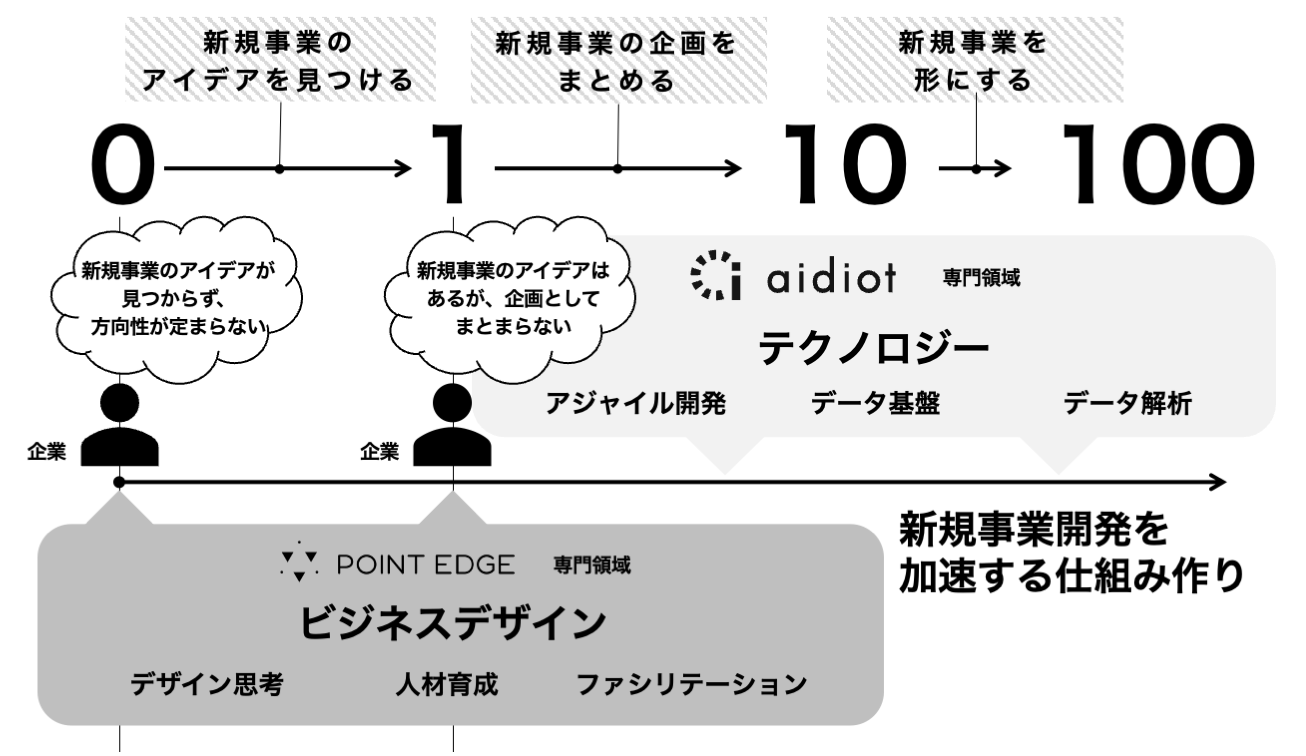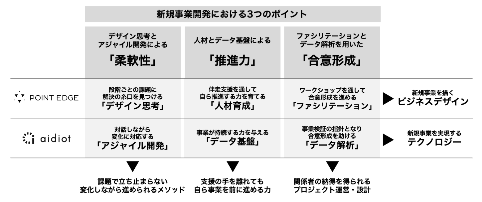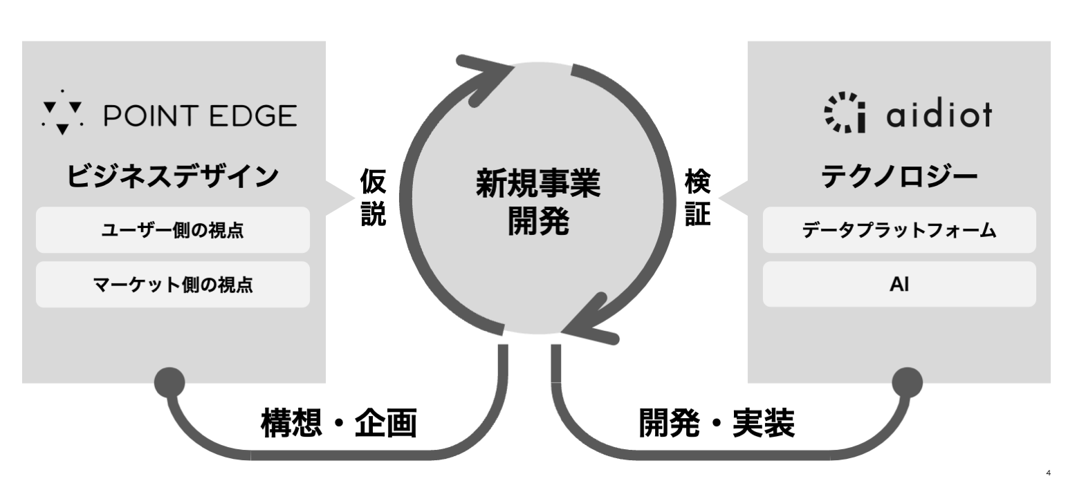 今回の業務提携により、POINT EDGEのビジネスデザインに加え、アイディオット社のテクノロジーが結びつくことで、アイディオット社の特徴である「アジャイル開発」「データ基盤」「データ解析」を取り入れ、新規事業に必要なポイント「柔軟性」「推進力」「合意形成」をさらに強化する狙いがあります。