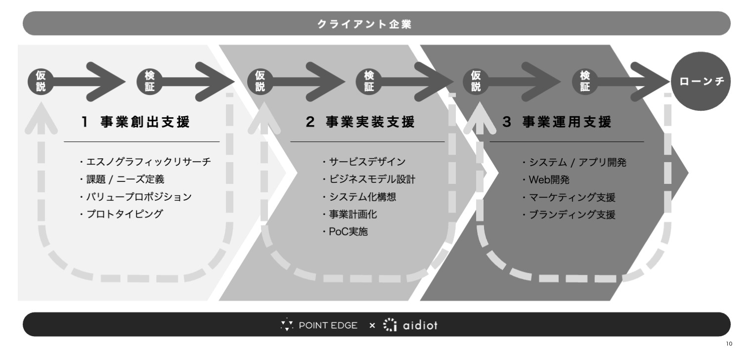「1.事業創出支援」「2.事業実装支援」「3.事業運用支援」の3段階を通して新規事業の構想から実装を行い、前半をPOINT EDGE、後半をアイディオットがメインリードをし、参加企業メンバーを含めたスクラムによるチーム形成を行います。各段階で両社が加わり、伴走支援を行いながら仮説と検証を繰り返します。