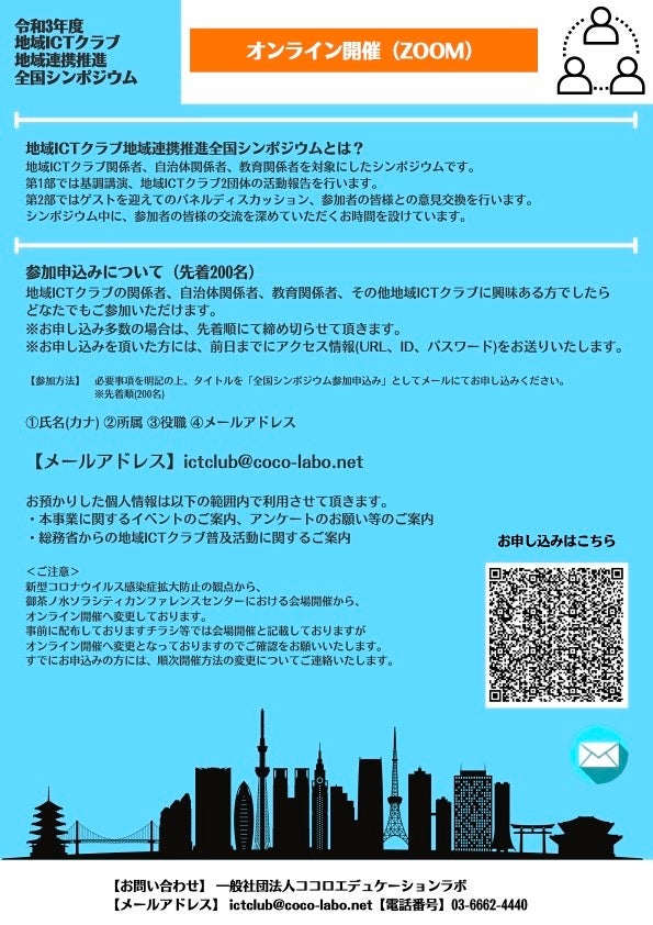 全国の地域ICTクラブ、自治体関係者、教育関係者等を対象に、全国でのプログラミング教育の最新情報を共有し、より地域との連携を強化することで、各地の地域ICTクラブの活動を応援するオンラインイベントとなります。