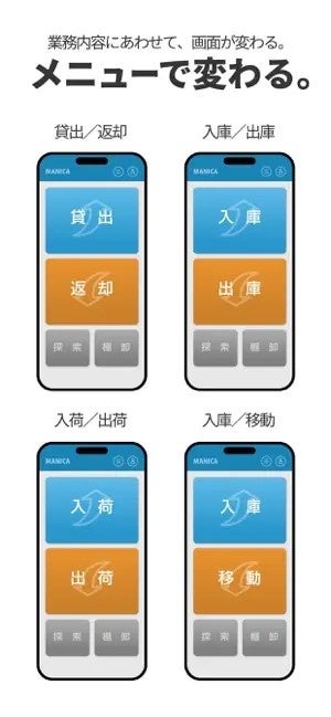管理画面からメニュー構成を自由に選択・変更可能。「貸出/返却」「入庫/出庫」「棚卸」など、様々な検品作業にノンカスタマイズで対応します。