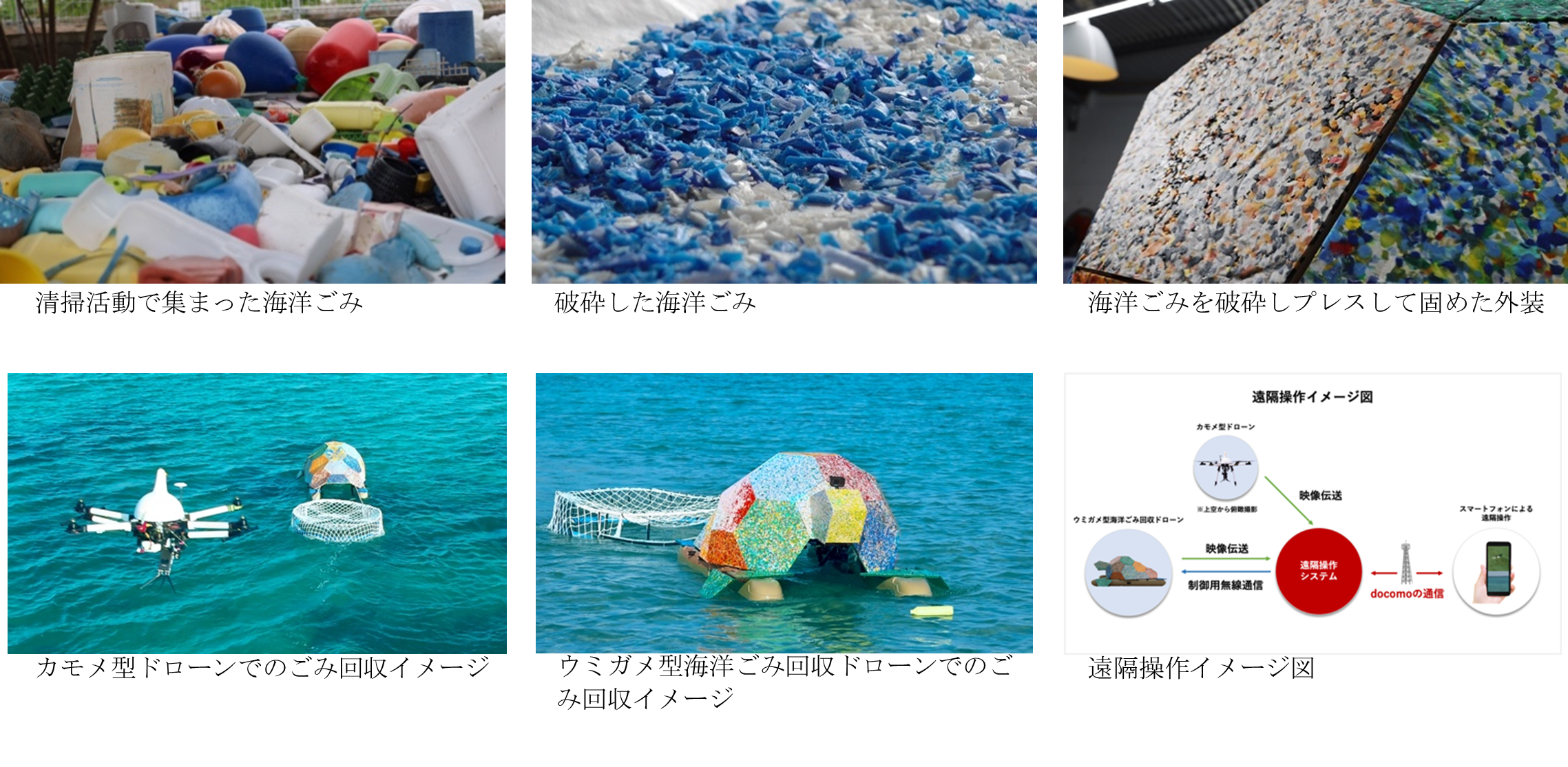 今回、清掃活動を通じて集めた海洋ごみの一部を使い、ウミガメ型海洋ごみ回収ドローンの外装と、アート作品を沖縄の地元の方々と共に製作しました。ウミガメ型海洋ごみ回収ドローンは、ドコモのネットワークを使用しスマートフォンで映像を見ながら遠隔操作が可能となっています。清掃活動に協力したくてもできない方も、今後5G通信をはじめとしたさまざまな技術を活用することで、今まで叶わなかったことが実現できていく未来への期待を感じていただけることを目指しました。