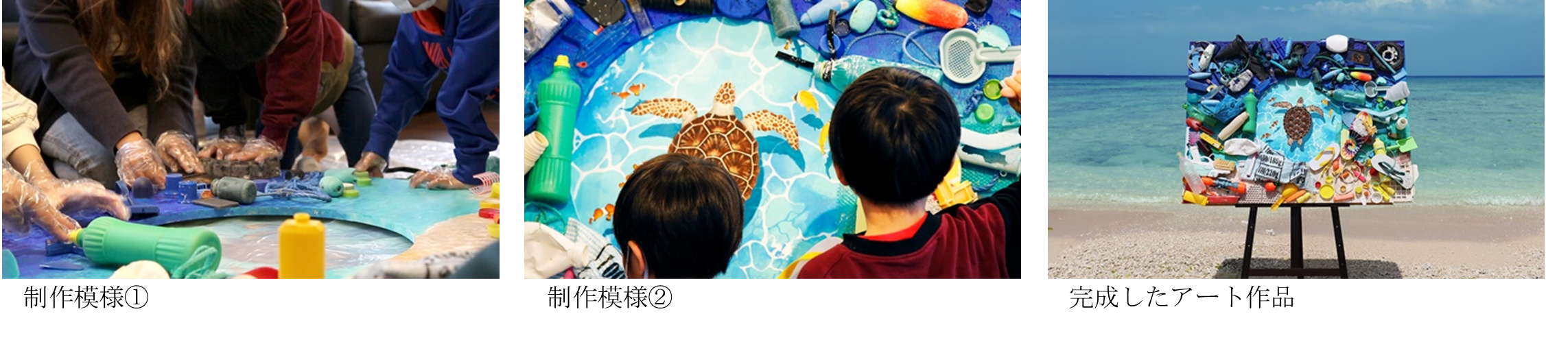 清掃活動を通じて集めた海洋ごみの一部を使って、沖縄の地元の学生と清掃活動を行うボランティアの方々と共同で制作。「未来へ」というタイトルをつけ、お披露目しました。