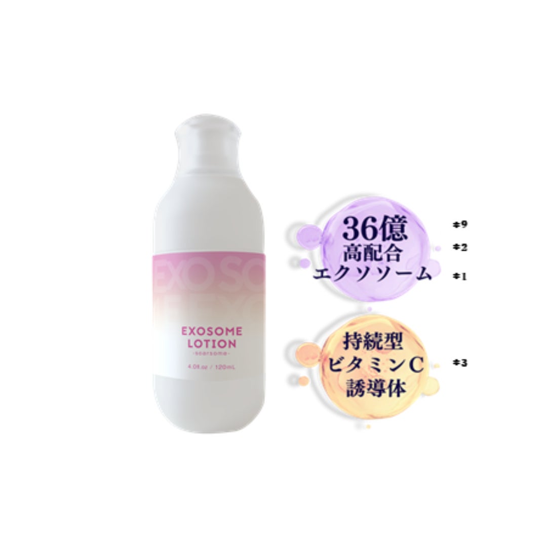 *1 ヒト脂肪由来間葉系細胞エクソソーム(整肌成分) *2 自社調べ *3 3-O-エチルアスコルビン酸(保湿成分) *4 スフィンゴ糖脂質(保湿成分) *5 全ての方にアレルギーが起きないというわけではありません *6 年齢に応じたケアのこと *7 3-O-エチルアスコルビン酸、トコフェリルリン酸Na、ナイアシンアミド、トコフェロール(すべて整肌成分) *8 スクワラン、オリーブ果実油、カニナバラ果実油、ホホバ種子油、マカデミア種子油(すべて保湿成分) *9 製品1本あたりのエクソソーム数/原料分析結果から導いた計算値
