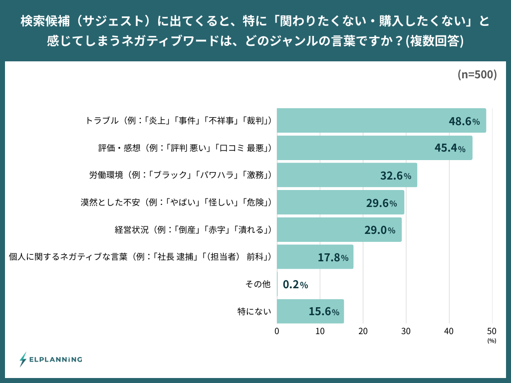 株式会社エルプランニング(東京品川区 代表取締役:中村啓二)は、全国の10代~60代以上の男女500名を対象に「検索エンジンに表示される検索候補(サジェスト)のネガティブワード」に関する調査を実施しました。