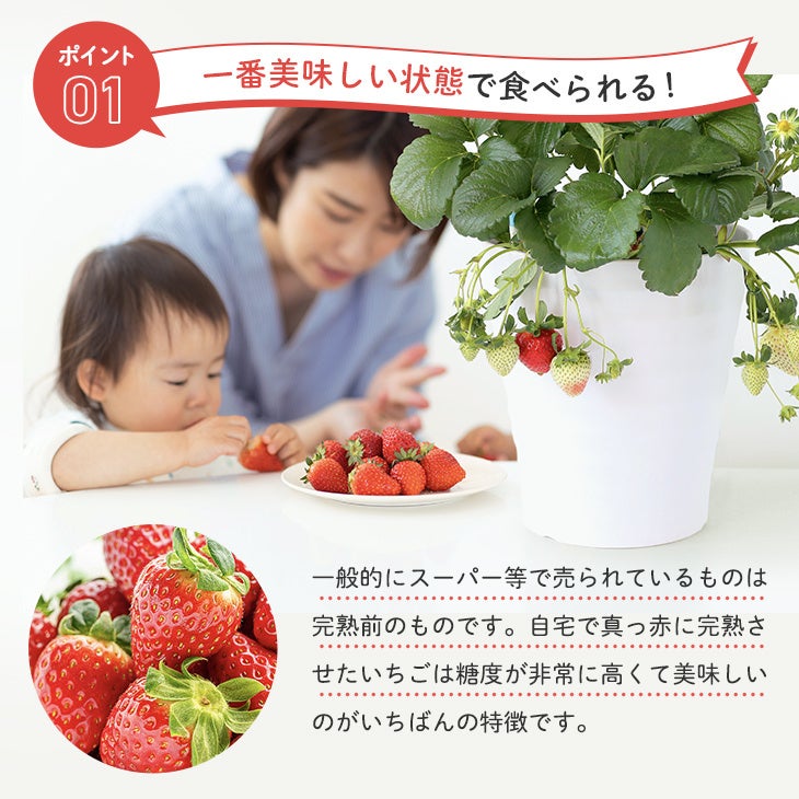 いちごの実がついた鉢は、食育にもなり、自宅で植物を育てる楽しみが広がります。スーパーでは手に入らない完熟いちごの美味しさを堪能でき、お子様でも簡単にお世話ができるのが特長です。
