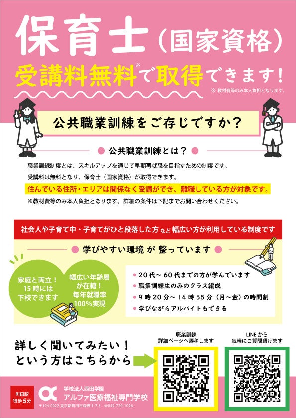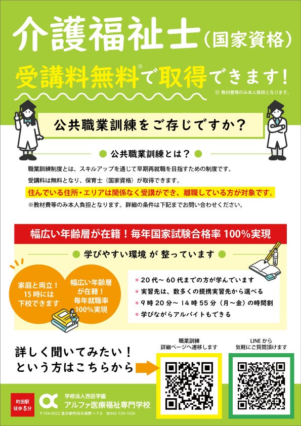 学校法人西田学園 アルファ医療福祉専門学校(東京都町田市)は、柔道整復師・鍼灸師・保育士・幼稚園教諭・介護福祉士・社会福祉士・精神保健福祉士の国家資格を取得する専門学校です。