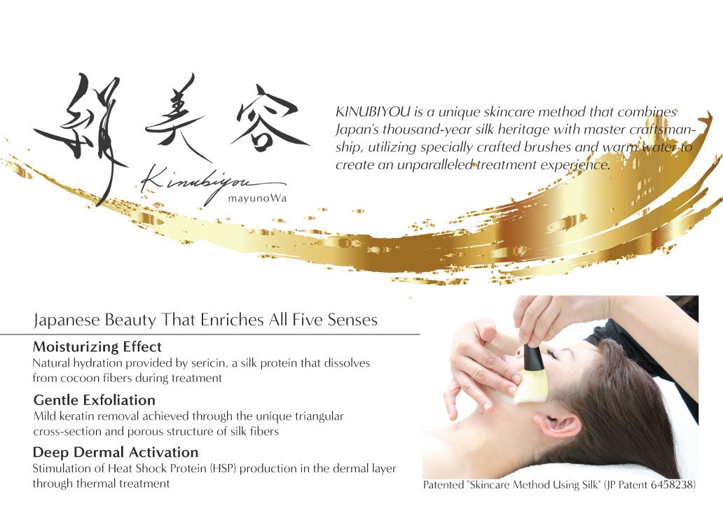 熊野筆の匠の技術と希少な純国産絹を融合させたオリジナルの洗顔筆(セリシンボーテ)を湯で温めながら肌を磨き上げる施術「絹美容®」を開発。肌の深部にある筋膜や経絡へと繊細にアプローチすることで、施術を受ける方を深い眠りへと導くリラクゼーション技術です。使用する素材すべてが肌と環境に配慮した絹美容®は、日常の喧騒から逃れストレスを短時間に解放したい現代人の目・肌・心を癒す日本独自のスパメニューとして、国内のラグジュアリーホテルSPAにも採用されています。