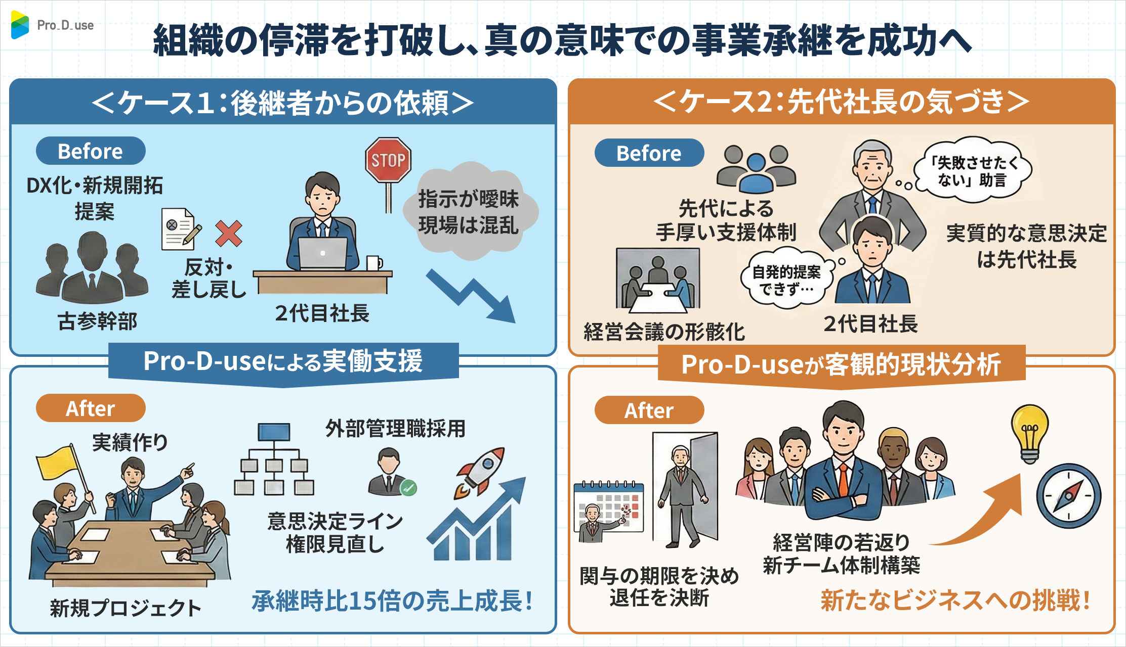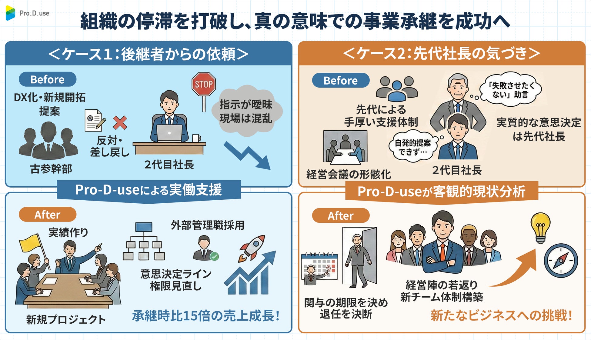 中小企業向け経営コンサルティングを提供する株式会社Pro-D-use(本社:東京都新宿区、代表取締役:小笠原 亮太)は、累計300件以上の経営相談や現場支援のなかで、事業承継において財務面だけでは解決しにくい、人と組織の課題に向き合ってきました。