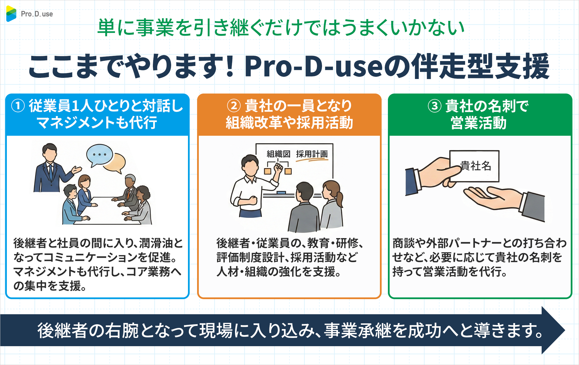 「事業承継において重要かつ困難なのは、法務や税務の手続きだけではなく『人の心と組織の承継』です。私たちは数多くの中小企業の現場で、先代の親心や、古参社員の会社への愛着が、皮肉にも後継者を苦しめている現実を見てきました。親子や長年の付き合いだからこそ言えないこと、進められない改革があります。Pro-D-useは、外部の『社長の右腕』としてその摩擦を吸収するクッションとなり、後継者が胸を張って『自分の会社』と言える状態になるまで、現場で泥臭く支援を続けてまいります。」