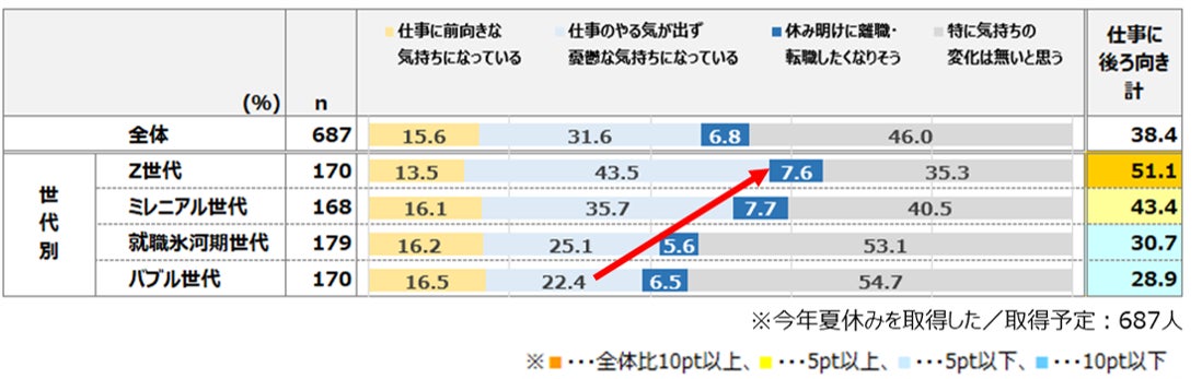●夏休み明けの仕事に向かう気持ちでは、「仕事のやる気が出ず憂鬱な気持ちになっている」が31.6%、「休み明けに離職・転職したくなりそう」が6.8%と仕事に後ろ向きな人が4割弱。