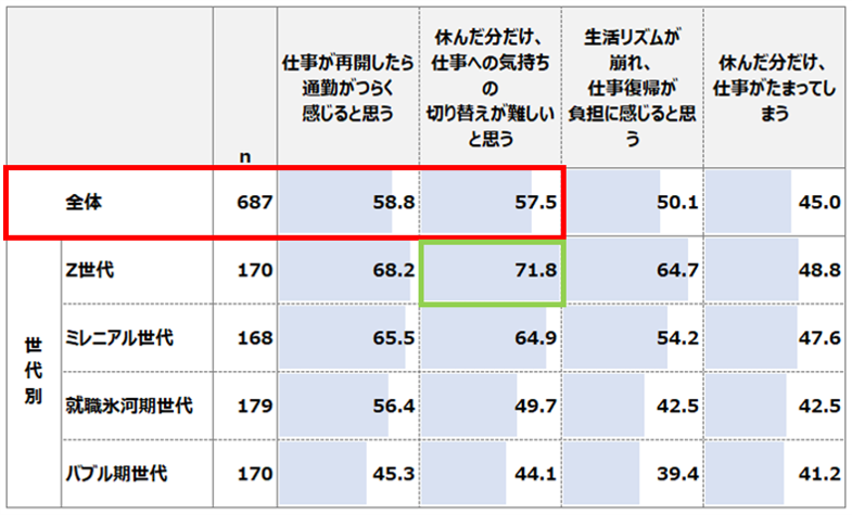 ・「仕事が再開したら通勤がつらく感じると思う」「休んだ分だけ、仕事への気持ちの切り替えが難しいと思う」が6割弱。