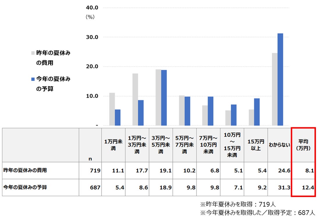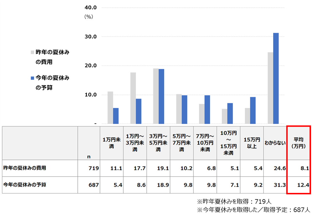 ●夏休みの平均予算は「12.4万円」で、昨年の8.1万円の1.5倍となっている。