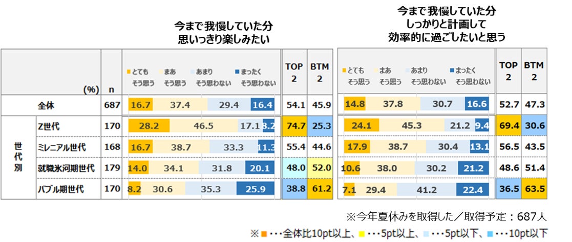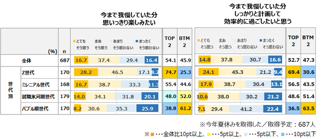 ・世代別に見ると、総じて若年層の方がポジティブな声が多く、特に「思いっきり楽しみたい」はZ世代が74.7%と高い。