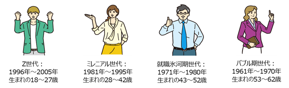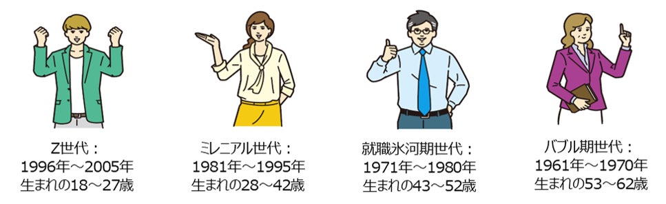 本調査中では以下のように定義しています。このうち、Z世代とミレニアル世代を若年層、就職氷河期とバブル期世代をミドルシニア層としています。