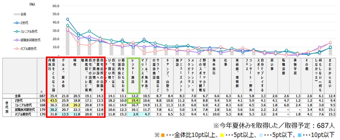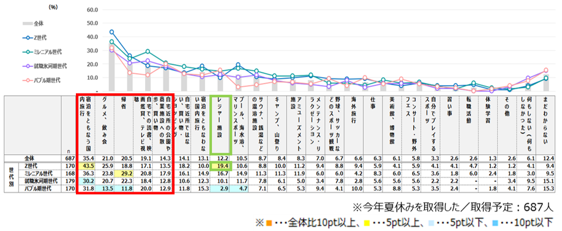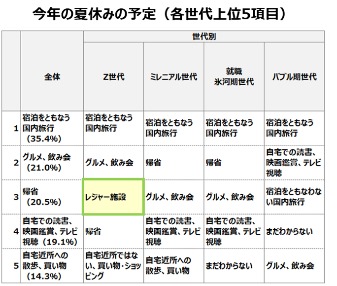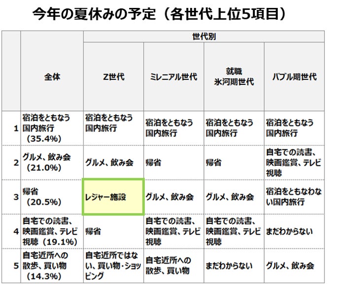 ●今年の夏休みの予定は「宿泊をともなう国内旅行」がトップ。Z世代は「レジャー施設」などアクティブに過ごす傾向。
