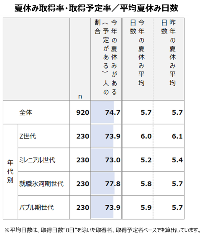 ●今年の夏休みを取る人、または取得予定の人は全体の3/4。平均取得日数は5.7日で、昨年と同数。