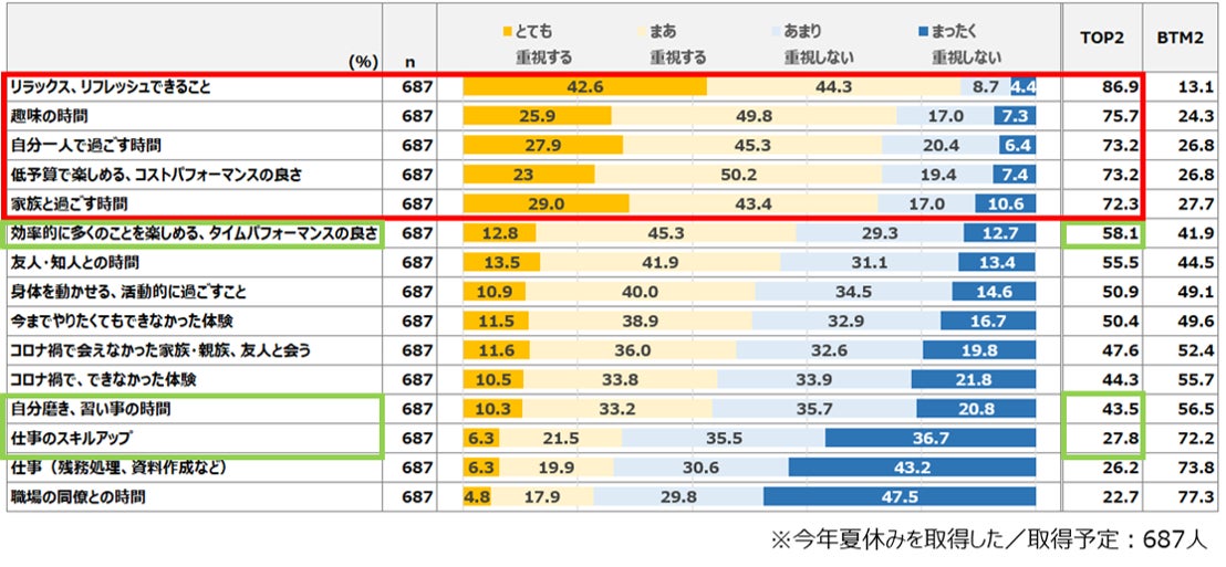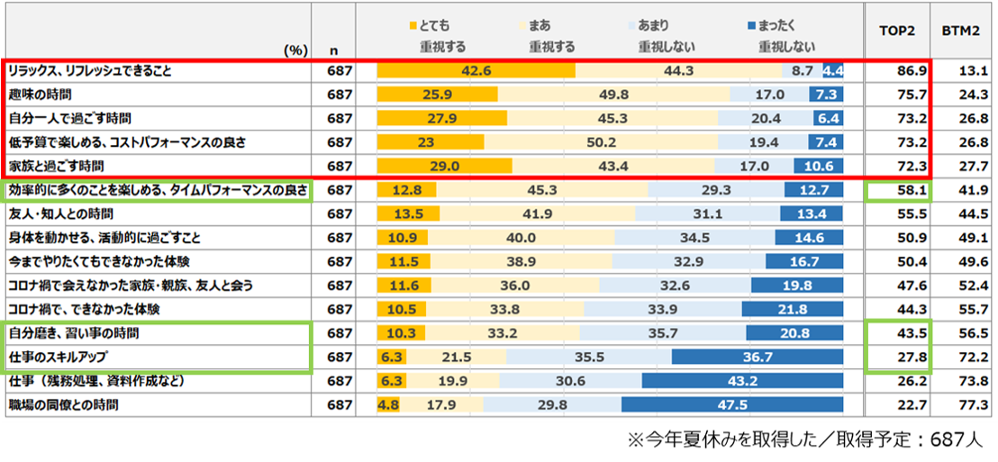 ・「効率的に多くのことを楽しめる、タイムパフォーマンスの良さ」も58.1%が重視している。