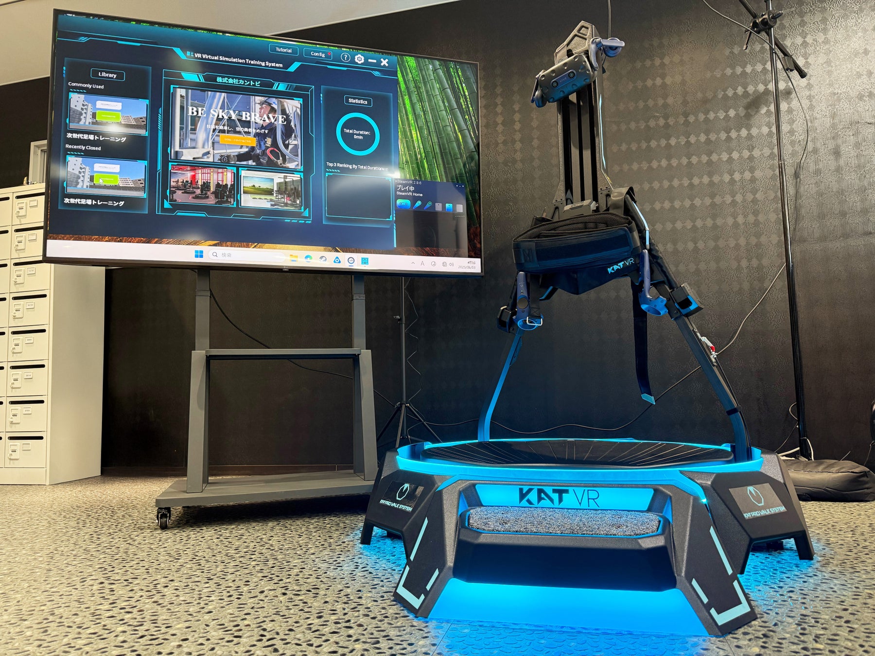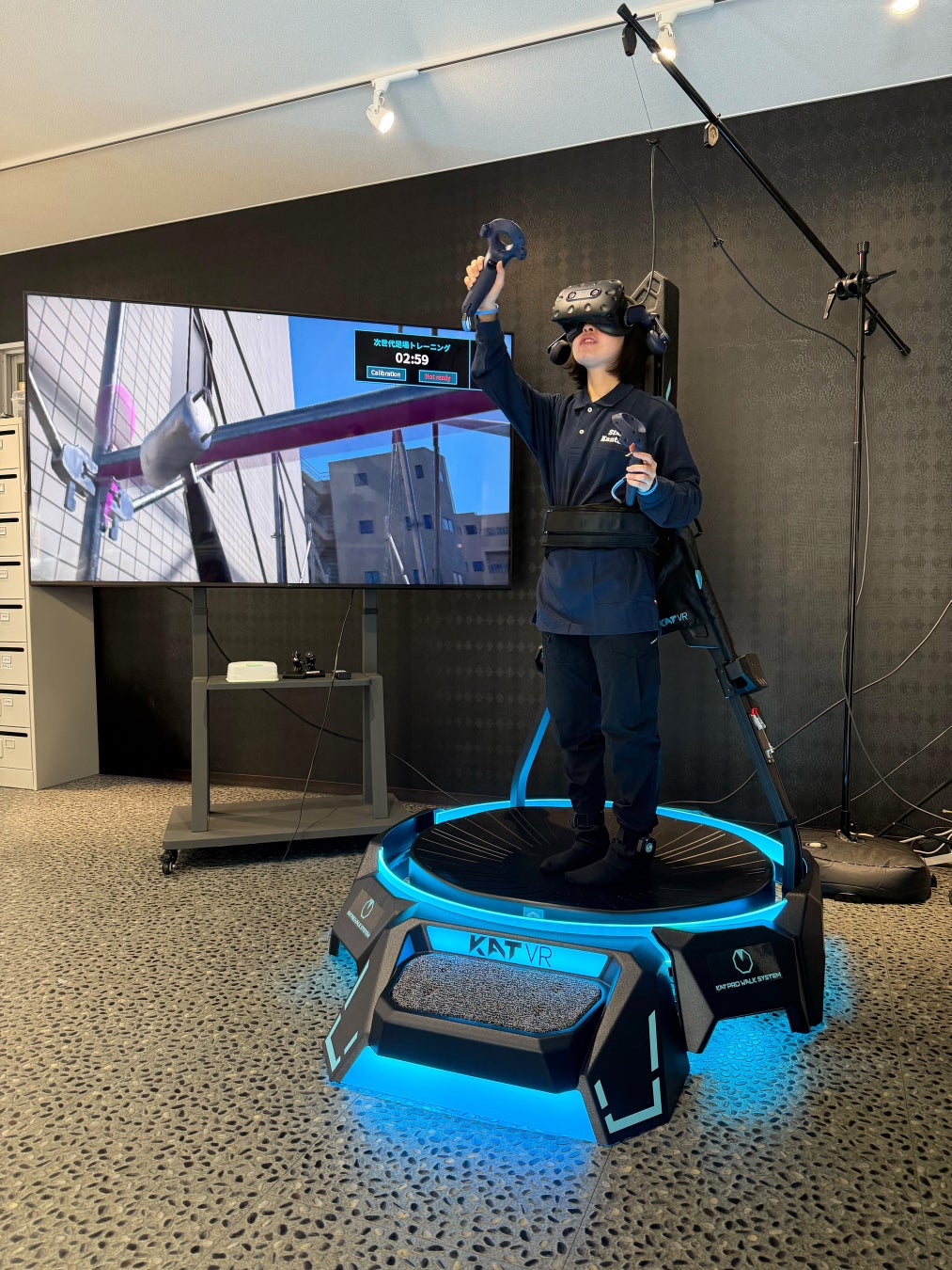 当社では、安全性と技術力が求められる足場工事において、「見て覚える」から「体験して学ぶ」への教育改革を推進しており、今回のKAT VR導入はその一環です。KAT VRは、360度の動作トラッキングが可能な歩行型VRシステムで、現場での作業を仮想空間で再現。社員は高所作業・資材運搬・安全確認といった実践的な動作を、リスクなく繰り返し学習できるようになります。