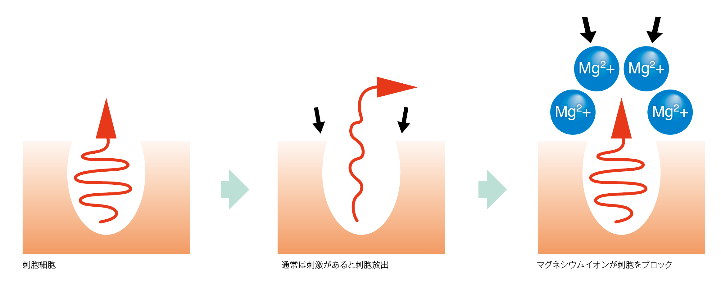 マグネシウムイオン・カルシウムイオンを独自比率で配合し、クラゲの毒針発射を抑制する世界初のメカニズム。